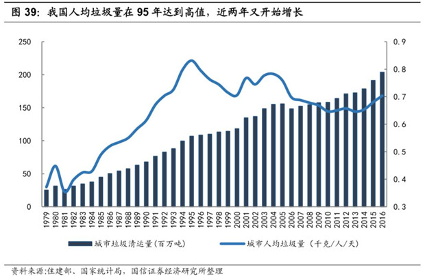 相對于美國,我國城市的垃圾清運量增速較快。從1979年開始,我國城鎮(zhèn)垃圾清運量以每年5.7%的增速快速增長了近40年,且增長態(tài)勢仍未見放緩。而從人均情況從1995年達(dá)到頂峰后,開始出現(xiàn)下降。2016 年生活垃圾清運量已經(jīng)達(dá)到 2.70 億噸,其中城市生活垃圾清運量 2.03 億噸,縣城生活垃圾清運量 0.67 億噸,近三年清運量增長率約在5%。