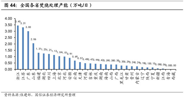 從垃圾焚燒產(chǎn)能分部來看,浙江、江蘇、廣東三省垃圾焚燒產(chǎn)能超過3萬噸/日,甘肅、貴州、內(nèi)蒙古、遼寧、陜西、寧夏、新疆、江西 8 省垃圾焚燒產(chǎn)能不足 3000 噸/日,而青海和西藏更是尚無垃圾焚燒項目。