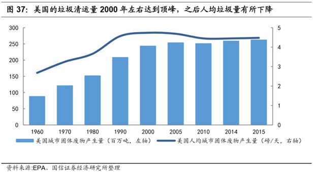 從上世紀(jì)60年代開始,美國城市的固體廢物產(chǎn)生量開始以年化1.5%的速度快速增長了40年,總固廢產(chǎn)生量從1960年的8800萬噸增長到2000年的2.5億噸,而人均固廢產(chǎn)生量也從2.68磅/天增加到了4.75磅/天。美國的垃圾清運量2000年左右達(dá)到頂峰,之后由于回收比例的提升和人們環(huán)保意識的增長,人均垃圾量有所下降,到2015年美國人均產(chǎn)生4.5磅/天左右的固體廢棄物。