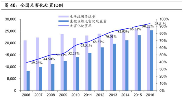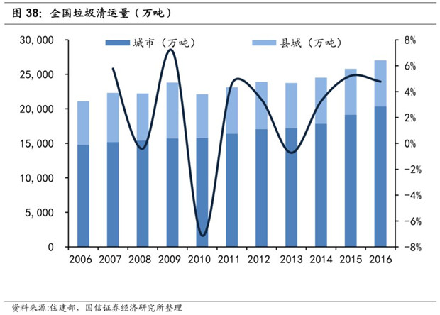 農(nóng)村地區(qū)垃圾處理仍處于初級階段。根據(jù)住建部發(fā)布的《城鄉(xiāng)建設(shè)統(tǒng)計年鑒》,農(nóng)村地區(qū)現(xiàn)每年產(chǎn)生垃圾總量穩(wěn)定在 6600 萬噸以上,人均垃圾產(chǎn)生量穩(wěn)定處于 0.3 千克/天的水平。2016年農(nóng)村人口占總?cè)丝诘?3%,農(nóng)村的人均垃圾產(chǎn)生量和垃圾清運比例有巨大的提升空間,所以考慮經(jīng)濟發(fā)展和農(nóng)村垃圾清運比例的提升,我國的垃圾焚燒市場未來空間仍然十分廣闊。