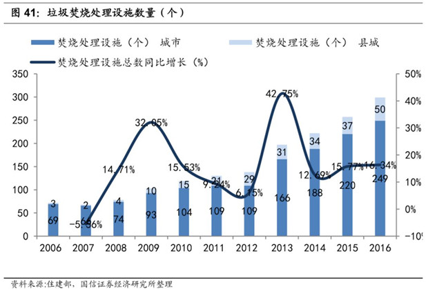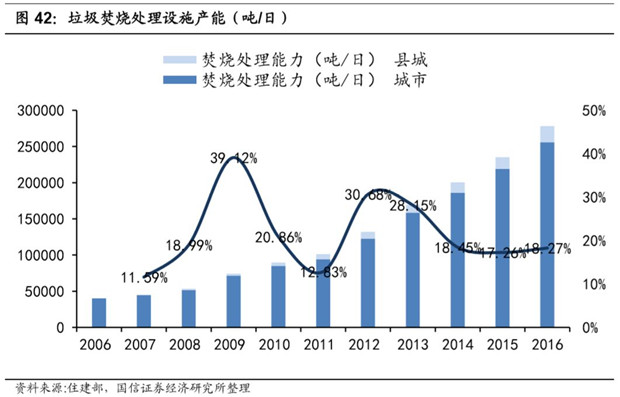 2016 年全國生活垃圾焚燒處理設(shè)施數(shù)量達(dá)到 299 個,同比增長 16.34%;生活垃圾焚燒處理能力達(dá)到 27.82 萬噸/ 日,同比增長 18.28%。2012-2016 年年均復(fù)合增速 20%左右。