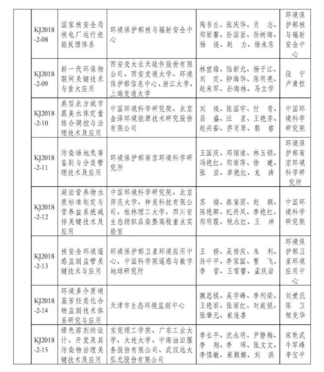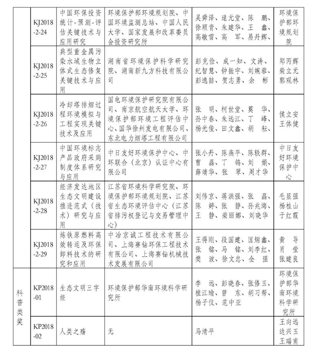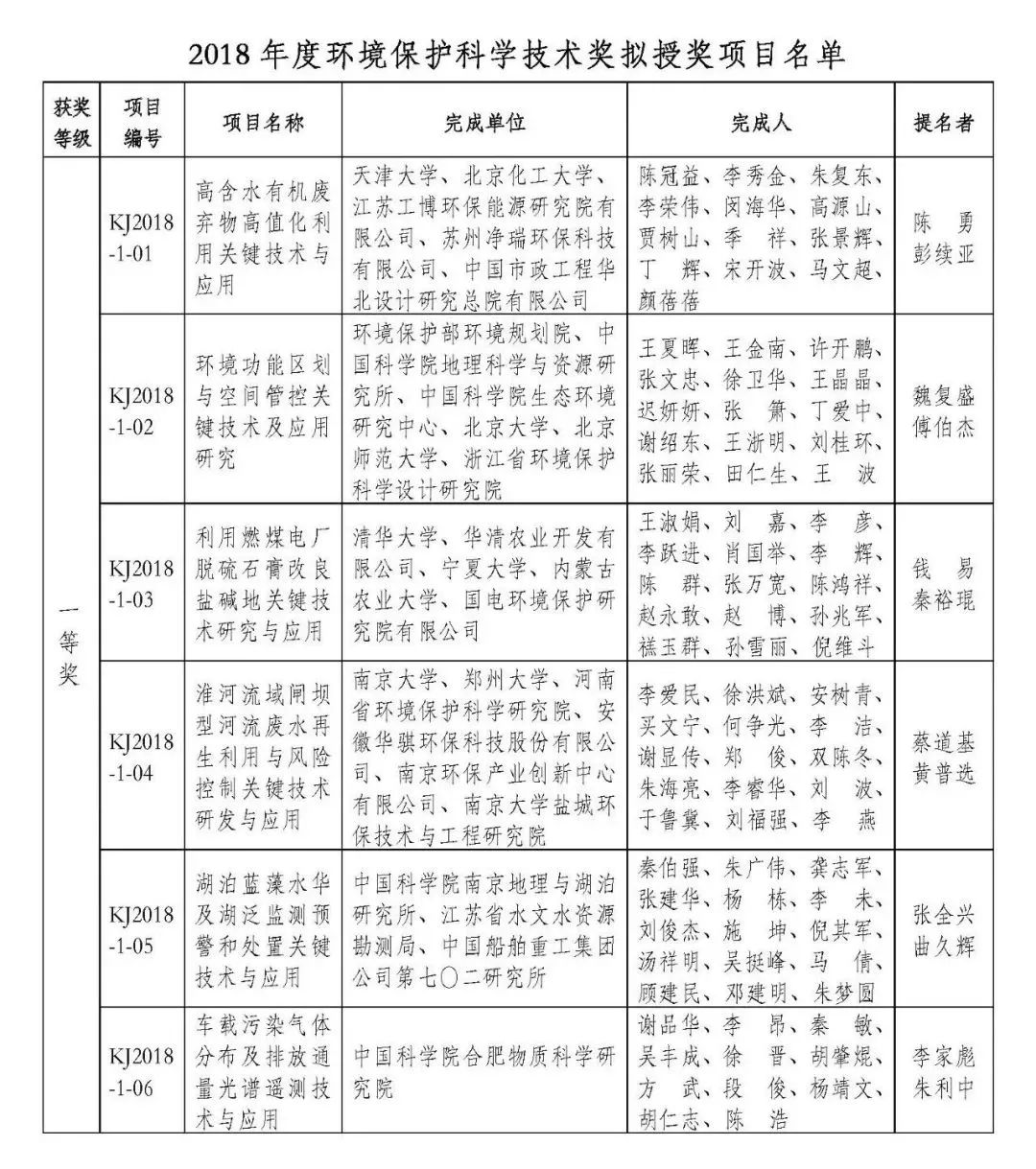 2018年度環(huán)境保護科學(xué)技術(shù)獎擬授獎項目名單