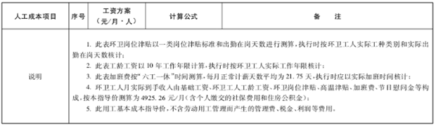 (二)環(huán)衛(wèi)用工成本指導價包括基礎工資、環(huán)衛(wèi)崗位津貼、環(huán)衛(wèi)工人工齡工資、高溫津貼、加班或者延長工作時間工資、國家法定節(jié)日和市環(huán)衛(wèi)工人節(jié)慰問金、社會保險(單位繳納部分)、住房公積金(單位繳納部分)8個部分,其他項目按照現(xiàn)有的法律、法規(guī)執(zhí)行。
