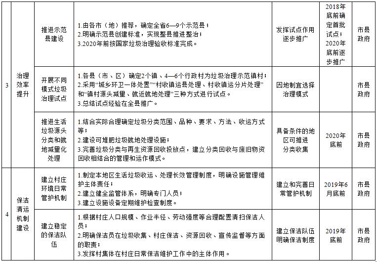 (一)制定農(nóng)村生活垃圾治理方案。各市(地)、縣(市、區(qū))要結(jié)合實(shí)際,堅(jiān)持按照“統(tǒng)籌考慮、分類指導(dǎo)、經(jīng)濟(jì)適用、保證效果”的原則,制定本地區(qū)農(nóng)村生活垃圾治理三年行動(dòng)方案。方案要重點(diǎn)確定農(nóng)村生活垃圾處理目標(biāo)任務(wù)、資金投入、責(zé)任部門和保障措施,合理選擇收運(yùn)處置模式和技術(shù)路線,明確各階段垃圾治理工作重點(diǎn),細(xì)化年度建設(shè)任務(wù)。各縣(市、區(qū))制定方案后,要組織編制本地區(qū)農(nóng)村生活垃圾治理設(shè)施建設(shè)專項(xiàng)規(guī)劃方案,充分考慮空間居民點(diǎn)布局調(diào)整和環(huán)境影響因素,科學(xué)確定整治村范圍、收集轉(zhuǎn)運(yùn)處理設(shè)施布局和建設(shè)規(guī)模,并經(jīng)專家論證通過后實(shí)施。各市縣《農(nóng)村生活垃圾治理方案》于2019年3月底前報(bào)省住建廳備案。