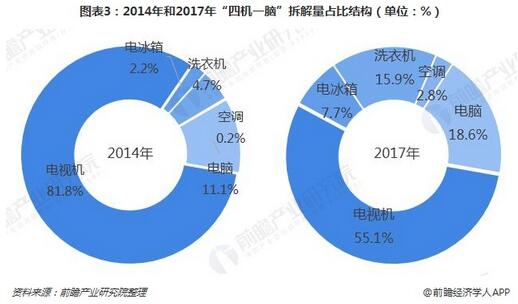 由上表可知,在2016年以后,電視機(jī)的補(bǔ)貼金額有所下降;電冰箱的補(bǔ)貼不變;而洗衣機(jī)、空調(diào)和電腦的的補(bǔ)貼卻有所提高。而這直接影響業(yè)內(nèi)企業(yè)拆解這五種廢品的積極性。根據(jù)環(huán)保部數(shù)據(jù),2013-2017年,中國的綠色回收率(實(shí)際拆解量占理論報(bào)廢量的比率)有上升趨勢,從2013年的37.94%提高到了2017年的70%以上。但是,電視機(jī)拆解量卻有減少趨勢,而電冰箱、洗衣機(jī)、空調(diào)、電腦的拆解量卻不斷增長。相較于2014年,2017年電視機(jī)拆解量占“四機(jī)一腦”拆解總量的占比大幅下降,為55.1%,下降了26.7個(gè)百分點(diǎn),而這主要是由于電視機(jī)拆解補(bǔ)貼減少所引起的。