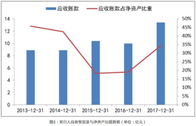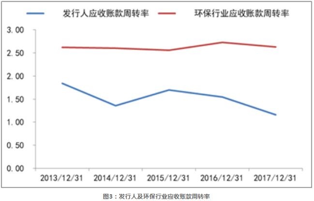 另一方面,從發(fā)行人違約前的近5年應(yīng)收賬款數(shù)據(jù)來看,如圖2所示,2013年到2017年,發(fā)行人的應(yīng)收賬款規(guī)模不斷增加,由8.91億元增長(zhǎng)到了13.39億元,其與凈資產(chǎn)的比值在發(fā)行人戰(zhàn)略轉(zhuǎn)型前的2013-2015年區(qū)間不斷下降,但轉(zhuǎn)型后該比值卻一路上升,由2015年的18.37%增長(zhǎng)到了2017年的34.40%;應(yīng)收賬款年周轉(zhuǎn)率2015年后也不斷下滑,從1.70降到了1.16,發(fā)行人的應(yīng)收賬款周轉(zhuǎn)率數(shù)據(jù)弱于環(huán)保行業(yè)整體水平。同時(shí),根據(jù)發(fā)行人2018半年報(bào)中數(shù)據(jù),截至2018年6月底發(fā)行人處于施工期BOT訂單11個(gè),未完成投資額37.72億元,尚未執(zhí)行的訂單27個(gè),擬投資金額為30.55億元,發(fā)行人未來的投資需求較大,資金壓力較大。