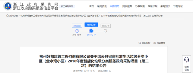 浙江省縉云縣省高標準生活垃圾分類小區(qū)(金水灣小區(qū))2018年度智能化垃圾分類服務(wù)政府采購項目發(fā)布結(jié)果公告,浙江聯(lián)運環(huán)境工程股份有限公司成為中標的社會資本方,中標金額33.45萬。