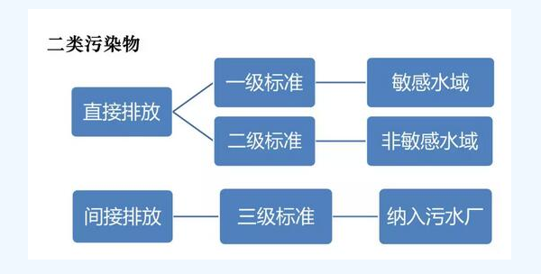 二類污染物92項(xiàng),在排污單位總排口采樣檢測(cè),二類污染物根據(jù)去向分為三級(jí),排入特殊保護(hù)水域的執(zhí)行特殊保護(hù)水域標(biāo)準(zhǔn),排入Ⅲ類水及二類海域的執(zhí)行一級(jí)標(biāo)準(zhǔn),向非敏感水域直接排放水污染物的排污單位執(zhí)行二級(jí)標(biāo)準(zhǔn),間接排放水污染物則執(zhí)行三級(jí)標(biāo)準(zhǔn)。