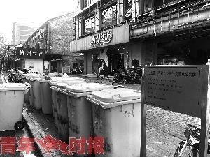 在垃圾分類工作中,可能最頭痛的還是廚余垃圾,因為不少是濕答答、有氣味的?!皬N余垃圾桶我們一般都是讓商家到了清運時間再拿出來,不然的話太影響環(huán)境了?!毙飕|棟說,商家產(chǎn)生的廚余垃圾,去年整個上城區(qū)日均是30噸,今年日均預計會達到50噸,“商家放廚余垃圾的垃圾桶,我們出標準后由店家自行采購,桶色要求必須是綠色的,這樣方便清運工人識別。”