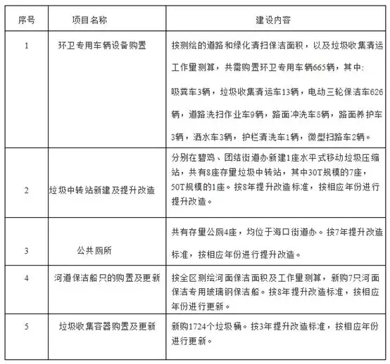 建設(shè)內(nèi)容主要包括環(huán)衛(wèi)專用車輛設(shè)備的購置和更新,垃圾中轉(zhuǎn)站的新建及提升改造,公共廁所提升改造,河道保潔船只的購置及更新,垃圾收集容器的購置及更新等,具體詳見下表: