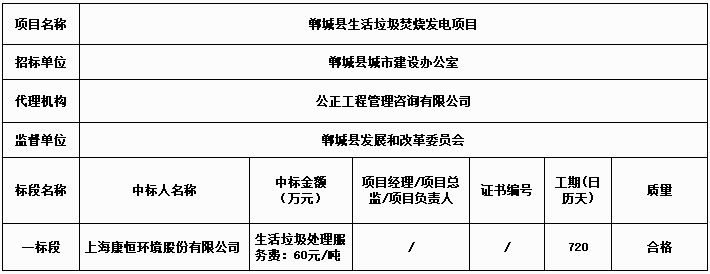 河南省周口市鄲城縣生活垃圾焚燒發(fā)電項(xiàng)目發(fā)布了中標(biāo)公告,上海康恒環(huán)境股份有限公司成為中標(biāo)的社會資本方,生活垃圾處理服務(wù)費(fèi)為60元/噸。