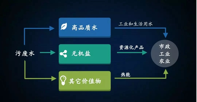 首先把污水里面的水提純?yōu)楦咂焚|(zhì)的再生水,回用于工業(yè)或者市政領(lǐng)域。產(chǎn)生的濃鹽水再次提純,產(chǎn)生有價(jià)值的工業(yè)產(chǎn)品、化工產(chǎn)品。同時(shí),污水里還有其他有價(jià)值的東西,比方說(shuō)熱能,也可以再次利用起來(lái)。