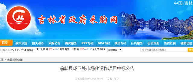 吉林省前郭縣環(huán)衛(wèi)處市場(chǎng)化運(yùn)作項(xiàng)目發(fā)布中標(biāo)公告,長(zhǎng)沙中聯(lián)重科環(huán)境產(chǎn)業(yè)有限公司成為中標(biāo)的社會(huì)資本方,中標(biāo)金額為2815.35萬(wàn)/年,服務(wù)期限10年,期限內(nèi)項(xiàng)目總金額達(dá)2.82億。
