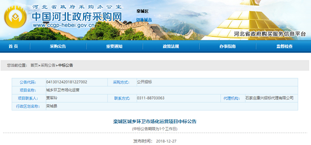 2018年12月27日,河北省欒城區(qū)城鄉(xiāng)環(huán)衛(wèi)市場化運營項目發(fā)布中標公示。