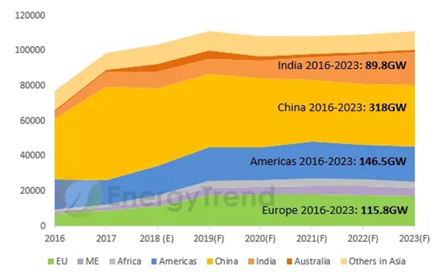全球市場規(guī)模自2018年起預(yù)計會持穩(wěn)在100-120GW之間,各年度需求量變化幅度將低于10%。而根據(jù)集邦新能源網(wǎng)EnergyTrend的最新需求報告統(tǒng)計,GW級市場從2016年的6個成長到2019年將有15個,可見市場持續(xù)分散化的趨勢。