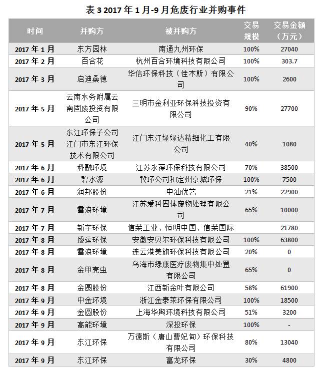 根據(jù)已有公開數(shù)據(jù)的不完全統(tǒng)計,截至2017年9月,2017年危廢行業(yè)發(fā)起并購行為19起起,累積交易金額32.46億元,并購方既包括像東江環(huán)保、啟迪桑德、新宇環(huán)保這樣的“行業(yè)老兵”,也不乏碧水源、盛運(yùn)環(huán)保、中金環(huán)境等“后起之秀”,更有金圓股份等“跨界來者”。