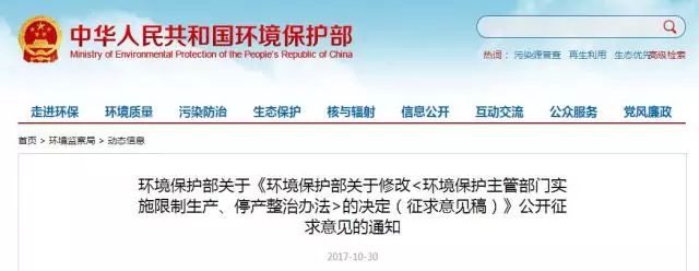 2017年10月30日,環(huán)境保護(hù)部網(wǎng)站公布修改《環(huán)境保護(hù)主管部門(mén)實(shí)施限制生產(chǎn)、停產(chǎn)整治辦法》的決定(征求意見(jiàn)稿)(以下簡(jiǎn)稱(chēng)“征求意見(jiàn)稿”),并向社會(huì)公開(kāi)征求意見(jiàn)。