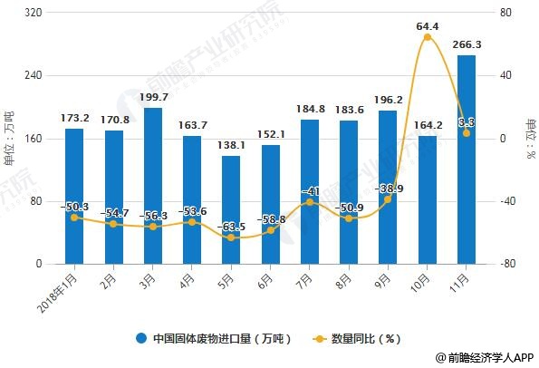 據(jù)前瞻產(chǎn)業(yè)研究院發(fā)布的《中國(guó)固廢處理行業(yè)市場(chǎng)前瞻與投資戰(zhàn)略規(guī)劃分析報(bào)告》統(tǒng)計(jì)數(shù)據(jù)顯示,2018年11月中國(guó)固體廢物進(jìn)口量大幅度增長(zhǎng),2018年11月中國(guó)固體廢物進(jìn)口量為226.3萬(wàn)噸,同比增長(zhǎng)3.3%。