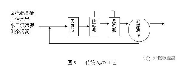 A2- O 法處理工藝是在好氧條件下,污水中NH3和銨鹽在硝化菌的作用下被氧化成NO2-—N和NO3-—N,然后在缺氧條件下,通過反硝化反應(yīng)將NO2-—N和NO3-—N還原成N2,達到脫氮的目的。A2/O是目前普遍采用的工藝,它是在法A/O法的基礎(chǔ)上增加一個厭氧段和一個缺氧段,傳統(tǒng)A2/O工藝流程如圖3所示。