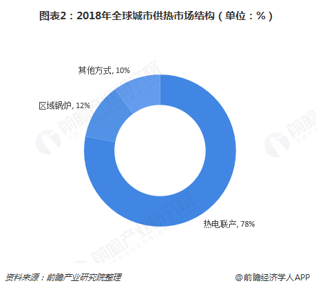 在城市供熱領(lǐng)域,熱電聯(lián)產(chǎn)也占據(jù)著重要地位。2018年,在全球城市供熱市場(chǎng)結(jié)構(gòu)中,熱電聯(lián)產(chǎn)供熱占比接近八成,約為78%,遠(yuǎn)高于區(qū)域鍋爐12%的比重。