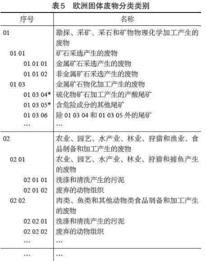 根據(jù)行業(yè)來源和廢物種類,歐盟制定了《歐洲廢物名錄》(2000/532/EC的修訂版)(European waste list)。該名錄共20大類(示例見表5),每一大類又根據(jù)生產(chǎn)工藝及不同工藝過程的廢物和所含物質(zhì)成分劃分為839種廢物。其中編號前標有*號的廢物共405種,表示經(jīng)鑒別表現(xiàn)出某種或多種危險特性或者含有危險組分超過規(guī)定含量標準的廢物,屬于危險廢物,需按照危險廢物進行管理。列入名錄的危險廢物分成兩類:不需進行特性鑒別的“絕對危險廢物”、仍需進行鑒別的“含有危險成分的廢物”,其中“絕對危險廢物”約為200種。