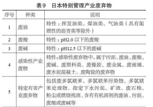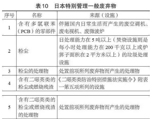 有別于歐美的廢物名錄管理體系,目前日本尚未形成一個完整的分類目錄,且沒有廢物代碼等信息?!稄U棄物處理法》根據(jù)廢物來源將廢物分為特別管理產(chǎn)業(yè)廢棄物和特別管理一般廢棄物。特別管理產(chǎn)業(yè)廢棄物是指產(chǎn)業(yè)廢棄物中具有爆炸性、毒性、感染性及其他可能危害人體健康或者生活環(huán)境性狀,而以政令規(guī)定的廢棄物(見表9)。特別管理一般廢棄物是指一般廢棄物中具有爆炸性、毒性、感染性及其他可能危害人體健康或者生活環(huán)境性狀,而以政令規(guī)定的廢棄物(見表10)。