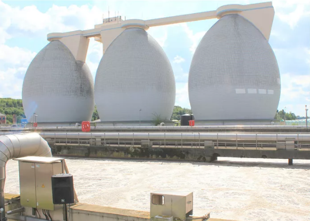污水在這三個巨型橢圓塔生成沼氣供給焚燒垃圾做燃氣
