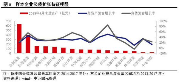 樣本企業(yè)總資產(chǎn)規(guī)模差異較大,負債帶動資產(chǎn)擴張?zhí)卣髅黠@。從2018年9月末資產(chǎn)規(guī)模來看,首創(chuàng)股份居首,啟迪桑德位于第二,均超過350億元,100-200億元的企業(yè)有4家,100億元以下企業(yè)10家。生活垃圾焚燒發(fā)電領(lǐng)域市場空間大,國家支持力度強,項目運營期經(jīng)濟效益穩(wěn)定,在PPP政策的推動下,業(yè)內(nèi)企業(yè)積極通過投資、并購占領(lǐng)市場,2013-2017年樣本企業(yè)總資產(chǎn)復(fù)合增速29.83%,16家樣本企業(yè)中有11家負債年復(fù)合增速超過總資產(chǎn)復(fù)合增速。