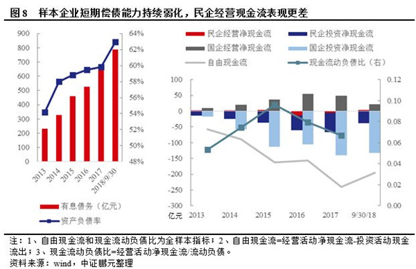 民營企業(yè)經(jīng)營現(xiàn)金流表現(xiàn)較差,投資活動對債務(wù)資金依賴性更高,再融資收縮對民企影響更大。樣本企業(yè)2016年以來經(jīng)營現(xiàn)金流表現(xiàn)不佳,自由現(xiàn)金流缺口不斷增加,現(xiàn)金流動負債比持續(xù)走低,短期償債能力弱化。相比之下,民營企業(yè)經(jīng)營凈現(xiàn)金流表現(xiàn)更差,投資活動對外部籌資依賴性很高。受銀行信貸、非標融資渠道收緊以及債市遇冷等外部因素影響,2018年前三季度民企籌資活動凈現(xiàn)金流僅為9.08億元,而2017年全年為68.41億元,外部融資急劇收縮,導(dǎo)致民企信用風險逐漸暴露。