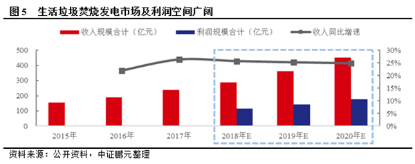根據(jù)垃圾處理“十三五”規(guī)劃,到2020年底,設(shè)市城市生活垃圾焚燒處理能力占無害化處理總能力的50%以上,其中東部地區(qū)達到60%以上。生活垃圾清運量上升及垃圾焚燒發(fā)電處理方式占比提升均可為行業(yè)增長提供支撐。以2016年生活垃圾焚燒無害化日處理能力25.59萬噸/日為基數(shù),按產(chǎn)能利用率80%,垃圾處理單價50元/噸,噸上網(wǎng)發(fā)電量280度,上網(wǎng)電價0.65元/度,單位產(chǎn)能投資額46萬元/萬噸/日,運營、設(shè)備制造及安裝、PPP工程業(yè)務(wù)利潤率分別為40%、35%、30%測算,中證鵬元預(yù)測2018-2020年生活垃圾焚燒發(fā)電行業(yè)市場空間分別為289.11億元、361.92億元和451.69億元,增速分別為25.67%、25.18%和24.80%,利潤空間分別為113.94億元、142.30億元和177.27億元。