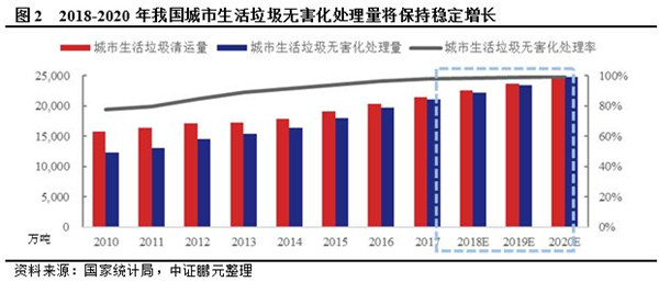 我國生活垃圾處理市場規(guī)模將保持增長?!丁笆濉比珖擎?zhèn)生活垃圾無害化處理設(shè)施建設(shè)規(guī)劃》(以下簡稱“垃圾處理十三五規(guī)劃”)指出,“十三五”期間全國規(guī)劃新增生活垃圾無害化處理能力50.97萬噸/日(包含“十二五”續(xù)建12.9萬噸/日),全國城鎮(zhèn)生活垃圾無害化處理設(shè)施建設(shè)總投資約2,518.4 億元。到2020年底,直轄市、計劃單列市和省會城市(建成區(qū))生活垃圾無害化處理率達到100%,其他設(shè)市城市、縣城(建成區(qū))、建制鎮(zhèn)生活垃圾無害化處理率分別達到95%、80%、70%以上。中證鵬元以2017年城市生活垃圾無害化處理率97.74%和城市生活垃圾清運量增速5.69%為基準,假定無害化處理率每年上升0.06個百分點,未來每年城市生活垃圾清運量增速為5%(考慮經(jīng)濟下行壓力,保守估計),測算2018-2020年我國城市生活垃圾無害化處理量分別為2.22億噸、2.35億噸和2.48億噸。根據(jù)2018年9月中共中央、國務(wù)院印發(fā)的《鄉(xiāng)村振興戰(zhàn)略規(guī)劃(2018-2022年)》要求,推進農(nóng)村生活垃圾治理、農(nóng)村污水處理、實施廁所革命、消除農(nóng)村黑臭水體、提升村容村貌是補齊突出短板的重要內(nèi)容。鄉(xiāng)村振興戰(zhàn)略作為2017年及2018年中央經(jīng)濟工作會議部署的重點工作,正逐步得到實施。隨著農(nóng)村未處理垃圾存量的消化和處理范圍擴大,未來農(nóng)村垃圾處理規(guī)模有較大增長空間。