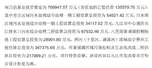 九江市中心城區(qū)水環(huán)境系統(tǒng)綜合治理一期項目總投資約77億元,采用PPP模式運作,合作期為20年,其中建設(shè)期2-3年,主要建設(shè)內(nèi)容包括芳蘭區(qū)域污水處理綜合治理一期工程、九江市芳蘭污水處理廠一期配套管網(wǎng)項目工程、芳蘭污水處理廠一期項目尾水凈化工程等六大板塊。