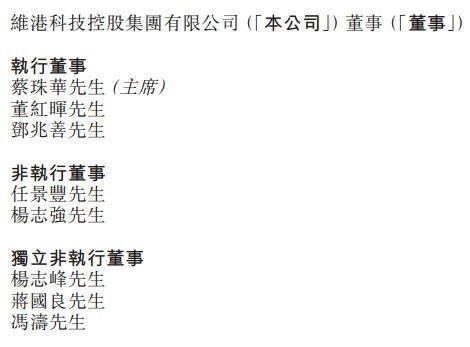 當前,維港環(huán)保執(zhí)行董事為蔡珠華(主席)、董紅暉、鄧兆善;非執(zhí)行董事為任景豐、楊志強;獨立非執(zhí)行董事為楊志峰、蔣國良、馮濤。