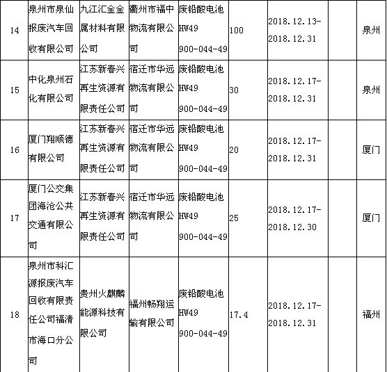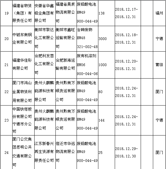 中國(guó)固廢網(wǎng)獲悉,日前福建省環(huán)境保護(hù)廳發(fā)布了《2018年12月福建省危險(xiǎn)廢物跨省轉(zhuǎn)移情況公告》,共有24項(xiàng),具體內(nèi)容如下: