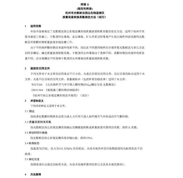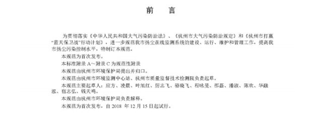 為貫徹落實(shí)國(guó)務(wù)院《打贏藍(lán)天保衛(wèi)戰(zhàn)三年行動(dòng)計(jì)劃》和《杭州市“清潔排放區(qū)”建設(shè)暨大氣污染防治2018年實(shí)施計(jì)劃》加強(qiáng)揚(yáng)塵監(jiān)管,安裝在線監(jiān)測(cè)和視頻監(jiān)控設(shè)備的工作要求,規(guī)范我市揚(yáng)塵在線監(jiān)測(cè)系統(tǒng)的建設(shè)、維護(hù)和管理工作,進(jìn)一步提高我市揚(yáng)塵污染防治水平。杭州市環(huán)境監(jiān)測(cè)中心站和杭州市質(zhì)量技術(shù)監(jiān)督檢測(cè)院經(jīng)過(guò)廣泛調(diào)研,結(jié)合我市實(shí)際,編制完成了《杭州市揚(yáng)塵在線監(jiān)測(cè)系統(tǒng)技術(shù)規(guī)范(試行)》,并在征求相關(guān)部門意見(jiàn)的基礎(chǔ)上,已進(jìn)行修改完善,現(xiàn)予以發(fā)布。