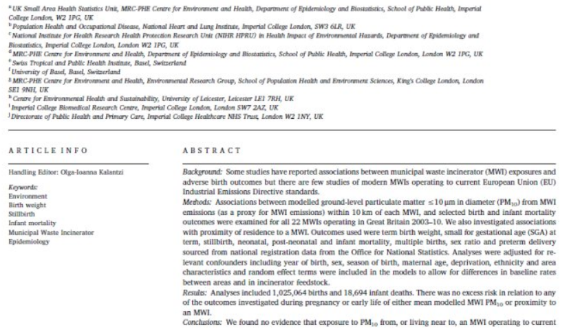 該研究由英國(guó)公共衛(wèi)生部門,英國(guó)大學(xué)和公共機(jī)構(gòu)資助,分析了2003—2010年間在英國(guó)運(yùn)營(yíng)的主要生活垃圾焚燒廠(MWI)排放的PM10潛在影響(這些焚燒廠達(dá)到歐盟標(biāo)準(zhǔn)運(yùn)行)。研究項(xiàng)目評(píng)估了生活垃圾焚燒廠附近新生兒數(shù)量超過(guò)100萬(wàn),評(píng)估參數(shù)包括:出生體重,足月胎齡,死胎,新生兒,新生兒和嬰兒死亡率,多胞胎,性別比和早產(chǎn)。