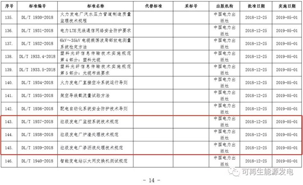 2018年12月25日,國(guó)家能源局發(fā)布2018年第16號(hào)公告,批準(zhǔn)了204項(xiàng)行業(yè)標(biāo)準(zhǔn),并予以發(fā)布。其中由中國(guó)電力企業(yè)聯(lián)合會(huì)垃圾發(fā)電標(biāo)準(zhǔn)化技術(shù)委員會(huì)提出并組織編制的第二批三項(xiàng)電力行業(yè)標(biāo)準(zhǔn)《垃圾發(fā)電廠監(jiān)控系統(tǒng)技術(shù)規(guī)范》(DL/T 1937-2018)、《垃圾發(fā)電廠爐渣處理技術(shù)規(guī)范》(DL/T1938-2018)、《垃圾發(fā)電廠滲瀝液處理技術(shù)規(guī)范》(DL/T 1939-2018),將于2019年5月1日起正式實(shí)施。