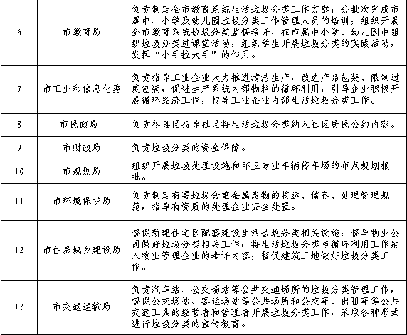 (五)動(dòng)員社會(huì)參與。積極開展生活垃圾分類宣傳,采用多種方式,利用多種渠道推廣普及生活垃圾分類的知識,讓廣大市民樹立垃圾分類、人人有責(zé)的環(huán)保理念,引導(dǎo)公眾從身邊做起、從點(diǎn)滴做起。強(qiáng)化國民教育,著力加強(qiáng)全體學(xué)生的垃圾分類和資源環(huán)境意識,建設(shè)一批生活垃圾分類示范教育基地,開展垃圾分類專業(yè)知識和技能培訓(xùn)。建立垃圾分類督導(dǎo)員及志愿者隊(duì)伍,引導(dǎo)公眾分類投放。充分發(fā)揮新聞媒體的作用,利用廣播、電視、報(bào)紙等傳統(tǒng)媒體和“兩微一端”等新媒體大力宣傳報(bào)道生活垃圾分類工作,形成良好社會(huì)輿論氛圍。