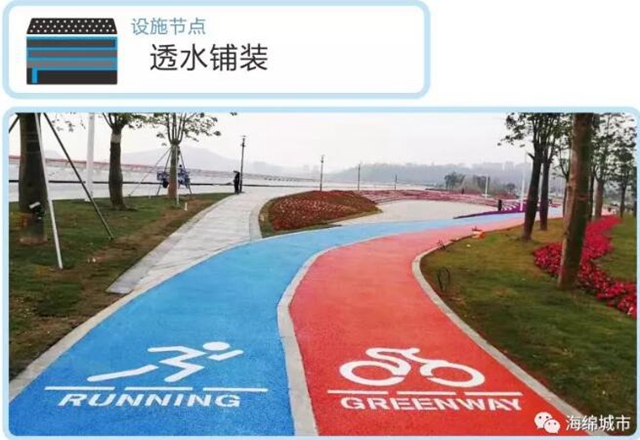 項目利用紅藍(lán)兩條濱水自行車道和綠道作為串聯(lián),將整個項目各分散部分完整地連接起來。整條透水海綿路面,利用經(jīng)特殊工藝處理的納米材料對膠凝材料進行改性,改善了無機聚合物材料的物相組成和微觀結(jié)構(gòu),使之具有高吸水率、高透水率、高強度、抗?jié)B、抗凍、抗沖、耐磨、耐化學(xué)腐蝕等顯著優(yōu)點,能對雨水進行初步凈化。同時,路面保護層采用水性環(huán)保耐磨材料,同時添加納米光觸媒材料,在提高耐磨性的同時,可有效降解汽車尾氣,改善空氣質(zhì)量。
