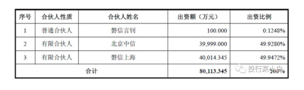 2014年8月5日,磐信言釗和北京中信投資中心(北京中信)簽署協(xié)議,共同出資設(shè)立磐信昱然。此后進(jìn)一步引入磐信上海,合伙企業(yè)出資額為80,113.345萬元,各方出資情況如下: