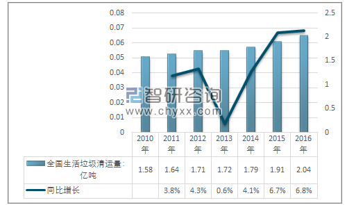 2010-2016年全國生活垃圾清運量及增長率