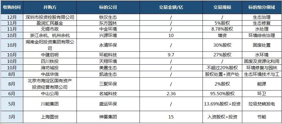 近年來環(huán)境產(chǎn)業(yè)的發(fā)展不斷得到政策傾斜,發(fā)展環(huán)境被看好,但2018年金融政策收緊,環(huán)境產(chǎn)業(yè)遭遇資本寒冬,環(huán)境企業(yè)資金鏈經(jīng)受了巨大的考驗,許多民營企業(yè)開始尋找突破口,尋求國資馳援成為了解決環(huán)境企業(yè)資金危機的方法之一。根據(jù)中國水網(wǎng)的不完全統(tǒng)計,2018年國有資本或國資參股企業(yè)進(jìn)行的并購項目至少有13起,涉及資金37億元人民幣。如四川鐵投擬收購天翔環(huán)境、中建啟明并購環(huán)能科技……