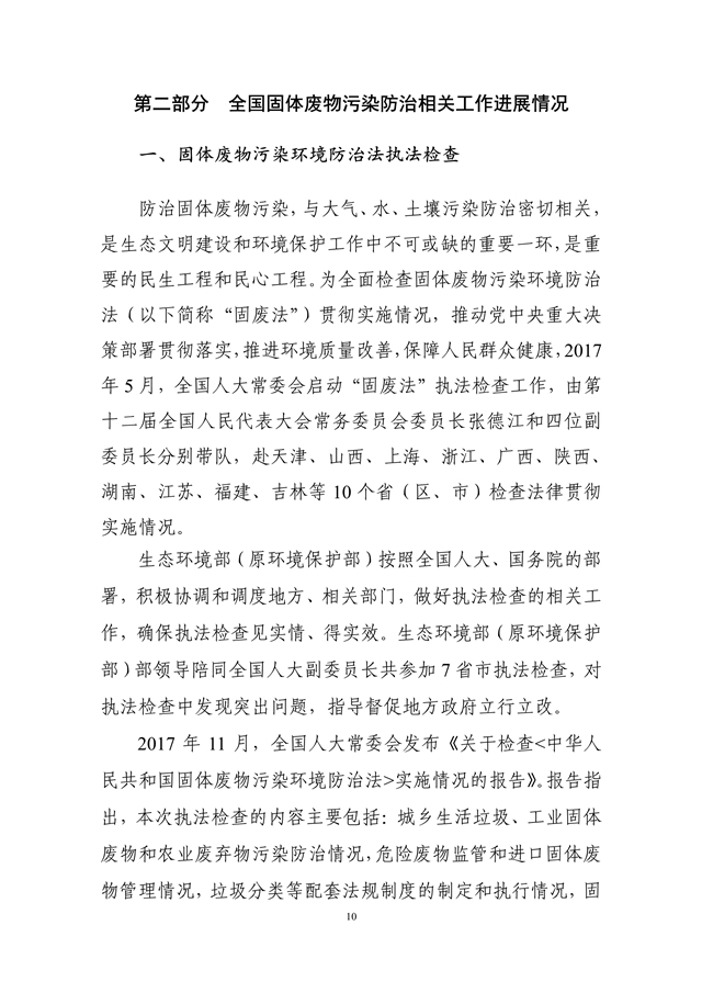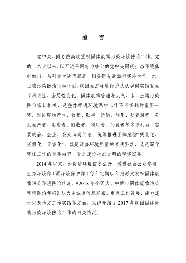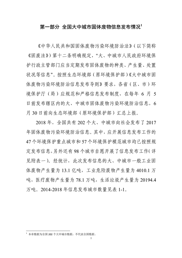 生態(tài)環(huán)境部發(fā)布了《2018年全國大、中城市固體廢物污染環(huán)境防治年報(bào)》,從大中城市信息發(fā)布、重點(diǎn)工作進(jìn)展、能力建設(shè)以及地方工作實(shí)踐等方面,系統(tǒng)介紹了我國固體廢物污染環(huán)境防治工作的相關(guān)情況。2014 年以來,為促進(jìn)環(huán)境信息公開、增進(jìn)社會(huì)公眾參與, 生態(tài)環(huán)境部(原環(huán)境保護(hù)部)每年定期以年報(bào)形式發(fā)布固體廢物污染環(huán)境防治信息。