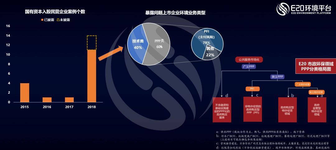 接著,薛濤對(duì)近年來(lái)發(fā)生的國(guó)有資本入資上市民企(參股及控股)情況進(jìn)行了簡(jiǎn)要分析。首先從下圖所顯示的數(shù)量上來(lái)看,前幾年發(fā)生的頻率均較低,但進(jìn)入2018年以來(lái)已經(jīng)超過(guò)10起,這與今年的金融、政策等大環(huán)境的變化息息相關(guān)。但進(jìn)一步拆分來(lái)看,2018年發(fā)生的事件中有40%是技術(shù)類企業(yè),沒(méi)有做任何類型的PPP,與PPP無(wú)關(guān)。而在與PPP相關(guān)的剩余60%的企業(yè)中,PFI模式成為主因的比例又達(dá)到了78%的比例,這些企業(yè)在前些年P(guān)PP高速增長(zhǎng)階段由于大量承接PFI項(xiàng)目帶來(lái)了大幅的業(yè)績(jī)?cè)鲩L(zhǎng)。但近年來(lái)由于金融、政策等大環(huán)境的變化導(dǎo)致過(guò)多PFI項(xiàng)目在手的這類企業(yè)受到了較大的沖擊,其中民企由于融資短板而受到了更大的影響,也才帶來(lái)這些事件的發(fā)生。合計(jì)評(píng)估,本輪PPP中的新增類型--PFI模式,結(jié)合資本泡沫的大起大落,確實(shí)是構(gòu)成2017年以來(lái)環(huán)保領(lǐng)域本輪國(guó)進(jìn)民退的主因。