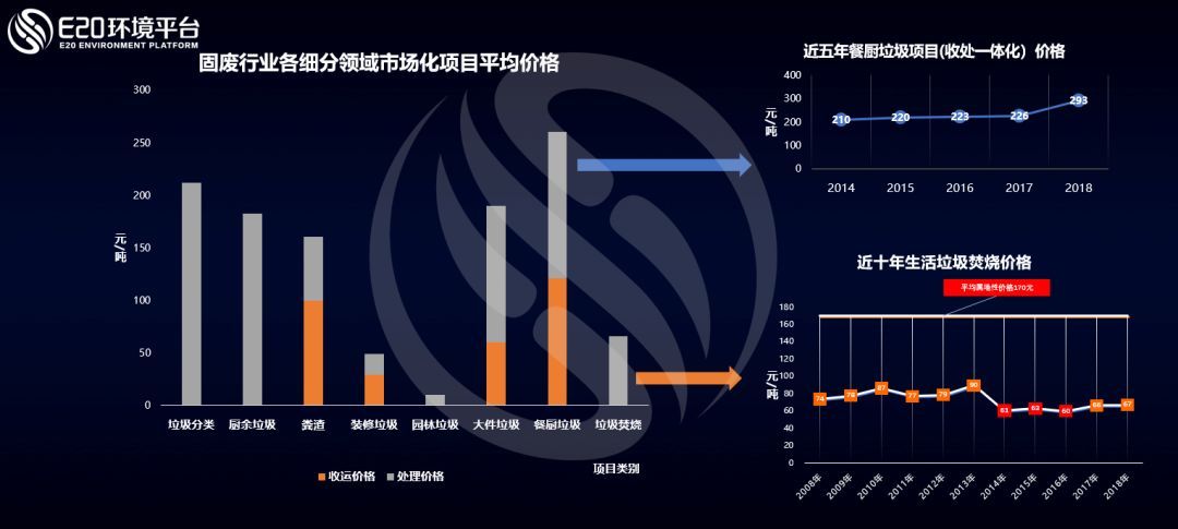 E20研究院多年來(lái)持續(xù)跟蹤關(guān)注固廢各細(xì)分領(lǐng)域市場(chǎng)化投資運(yùn)營(yíng)項(xiàng)目的服務(wù)價(jià)格。對(duì)比水務(wù)行業(yè),總體來(lái)看固廢行業(yè)收運(yùn)環(huán)節(jié)較為特殊,在很多固廢細(xì)分領(lǐng)域的項(xiàng)目當(dāng)中都單獨(dú)出現(xiàn)了收運(yùn)價(jià)格,因此我們將收運(yùn)價(jià)與處置價(jià)分開來(lái)看。近年來(lái)大家關(guān)注較多的是垃圾焚燒的項(xiàng)目?jī)r(jià)格,我們可以看到近10年來(lái),我國(guó)垃圾焚燒市場(chǎng)化項(xiàng)目的BOT價(jià)格基本穩(wěn)定,略有升高,但同時(shí)可以注意到,屬地性項(xiàng)目的價(jià)格較市場(chǎng)化項(xiàng)目來(lái)講高出很多,這也從側(cè)面反映了市場(chǎng)化對(duì)于降低成本的作用。