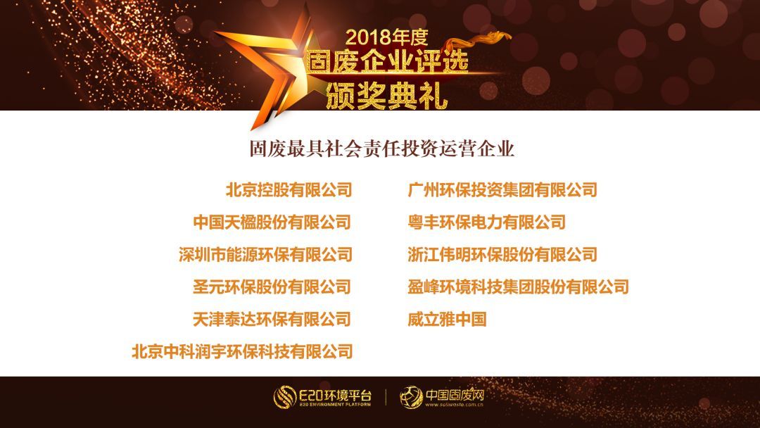 根據(jù)各項(xiàng)指標(biāo)綜合評(píng)估,我們隆重祝賀今年的年度固廢影響力企業(yè)、固廢最具社會(huì)責(zé)任投資運(yùn)營(yíng)企業(yè):