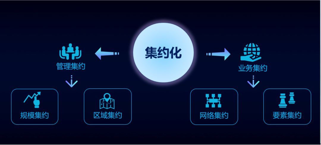 為了深入分析如何達(dá)成提高運(yùn)營(yíng)長(zhǎng)期效率這個(gè)目標(biāo),E20研究院將其集約化類型劃分為兩大類,四小類進(jìn)行解析。分別是管理集約型,包括區(qū)域集約型和規(guī)模集約型兩類;業(yè)務(wù)集約型,包括網(wǎng)絡(luò)集約型和要素集約型兩類??傮w來(lái)講,集約化的核心就是集中管理,提高效率。