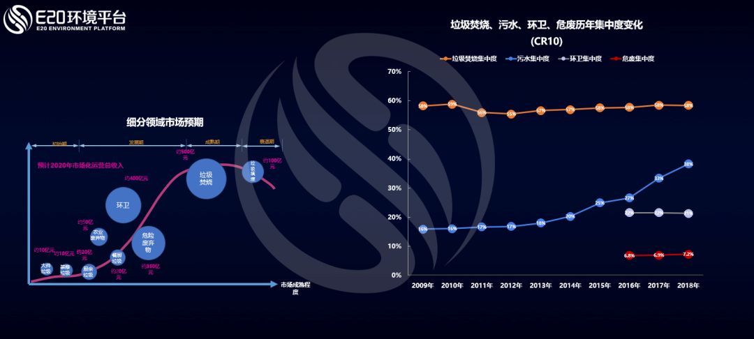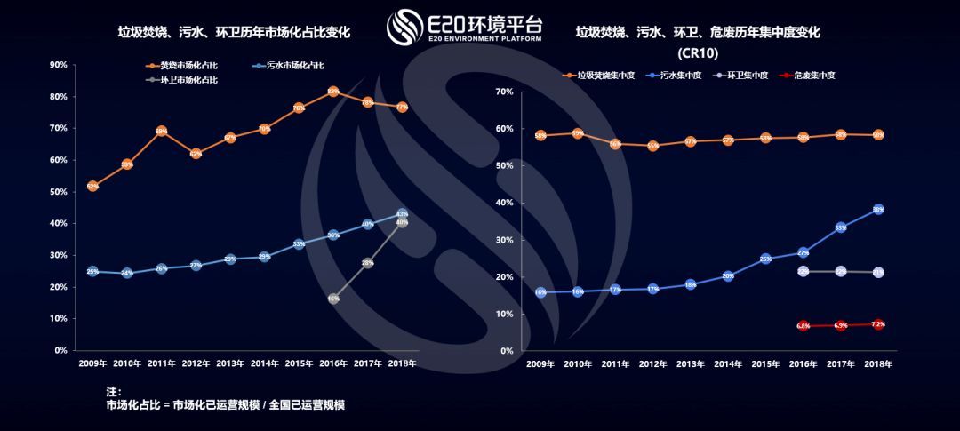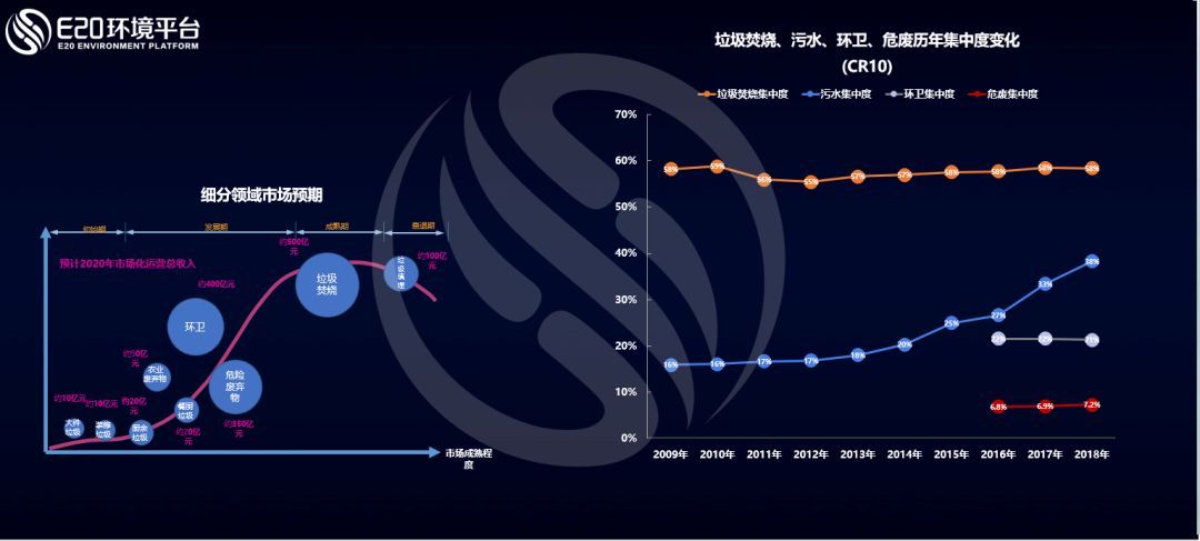 而通過(guò)E20研究院數(shù)據(jù)中心對(duì)各細(xì)分領(lǐng)域龍頭企業(yè)的跟蹤調(diào)研發(fā)現(xiàn),我國(guó)生活垃圾焚燒領(lǐng)域市場(chǎng)集中度CR10(前十家企業(yè)的市場(chǎng)占有率之和)近10年來(lái)穩(wěn)定在58%左右;污水處理行業(yè)集中度CR10持續(xù)增長(zhǎng),至2018年達(dá)到38%左右;環(huán)衛(wèi)行業(yè)和危廢行業(yè)的市場(chǎng)集中度CR10均基本穩(wěn)定,分別保持在20%和7%左右,市場(chǎng)仍較分散,這個(gè)原因是市場(chǎng)釋放非???,新進(jìn)入者眾多,仍處于行業(yè)的快速上升期。