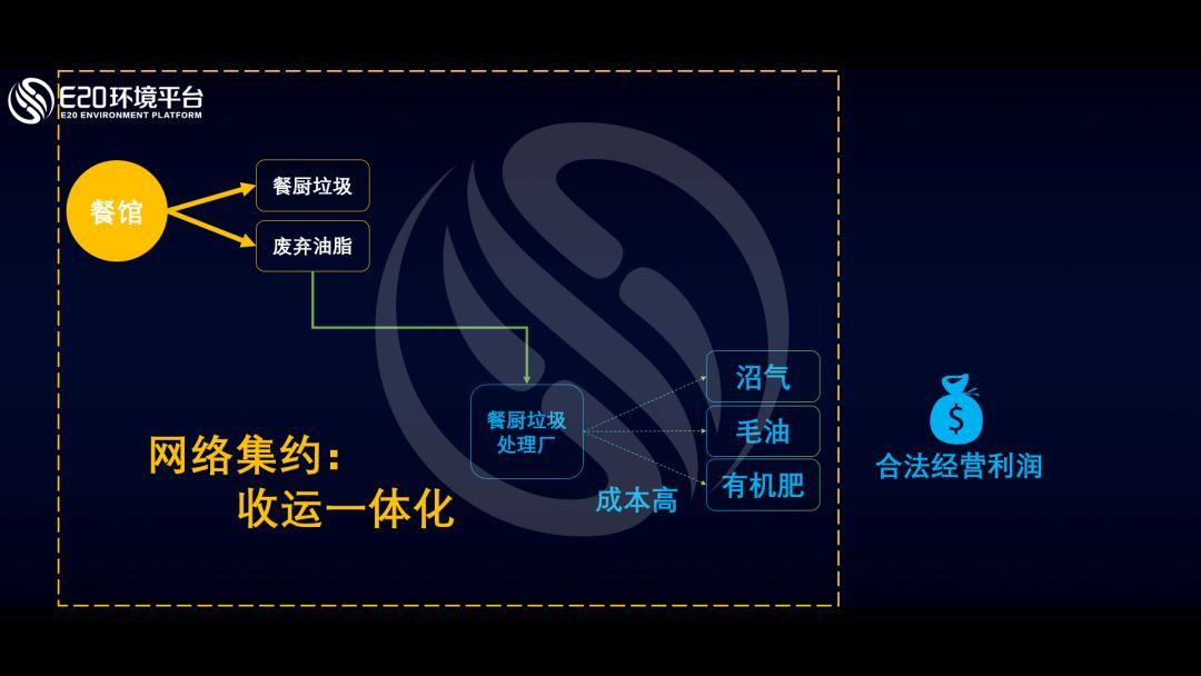 目前,隨著企業(yè)收運(yùn)能力的提升以及地方政府因豬瘟危機(jī)而被迫啟動(dòng)的強(qiáng)力監(jiān)管(政府承諾的遲到的兌現(xiàn)),餐廚運(yùn)營(yíng)環(huán)境有所改善。同時(shí),一些領(lǐng)先的餐廚運(yùn)營(yíng)企業(yè)通過(guò)智慧化管理介入前端收運(yùn),實(shí)現(xiàn)網(wǎng)絡(luò)集約,一方面幫助企業(yè)能有效降低收運(yùn)成本;另一方面企業(yè)能獲得足夠的餐廚垃圾,形成包括沼氣、毛油、有機(jī)肥等末端產(chǎn)品來(lái)獲得收益。值得一提的是,前面所述主要是前端的網(wǎng)絡(luò)集約,另一個(gè)重要的方向是后端的網(wǎng)絡(luò)集約,即末端產(chǎn)品的銷售如何順利達(dá)成。