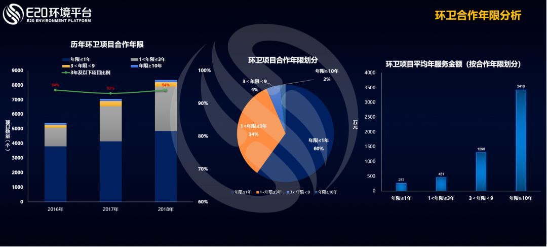 從合作年限來(lái)看,歷年環(huán)衛(wèi)項(xiàng)目合作年限分布總體穩(wěn)定,一年期及三年以內(nèi)的項(xiàng)目數(shù)量有一定增加。上圖的中間餅圖中可以看到近三年的數(shù)據(jù),有2%的環(huán)衛(wèi)項(xiàng)目是十年以上的PPP項(xiàng)目。
